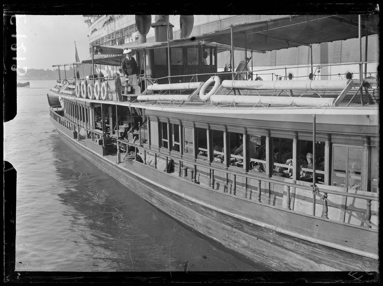 Toulon. Navire hôpital La France. Malades transportés du navire hôpital La France sur le remorqueur l'hirondelle.