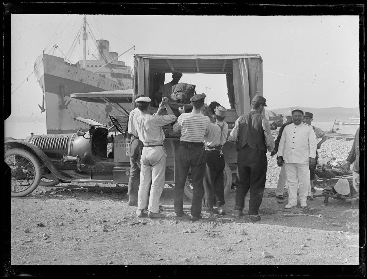 Arrivée de malades et de blessés à Toulon et transfert vers les hôpitaux.