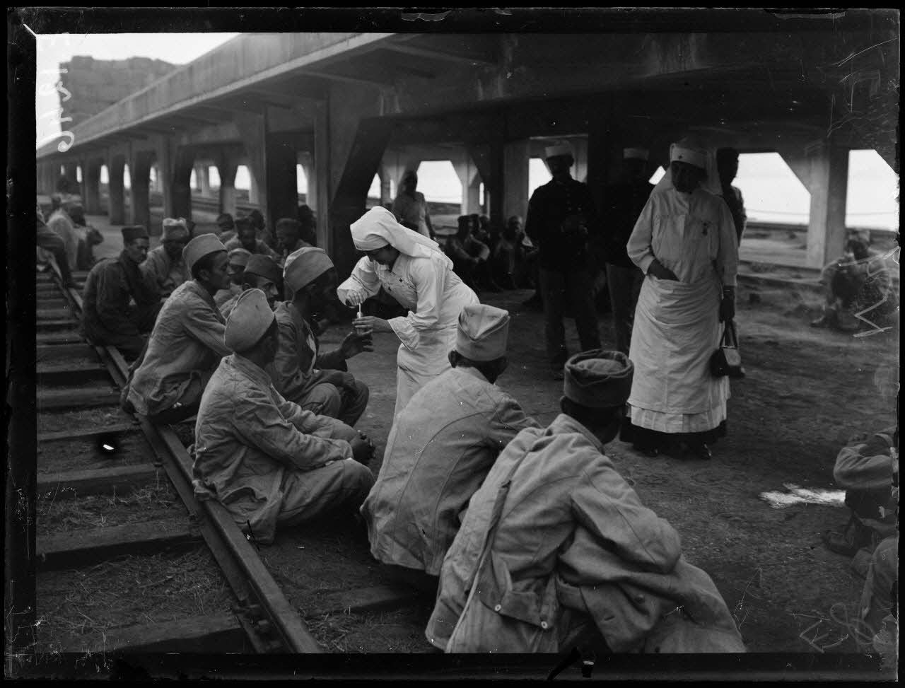 Toulon. Dames de la Croix-Rouge donnant à boire aux malades serbes. [légende d'origine]