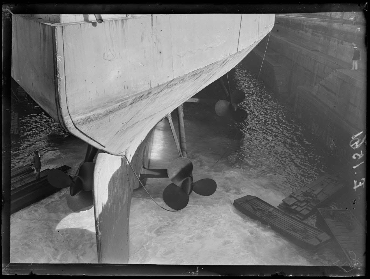 Toulon. Le cuirassé "La France" s'apprêtant à sortir de cale sèche. L'hélice. [légende d'origine]