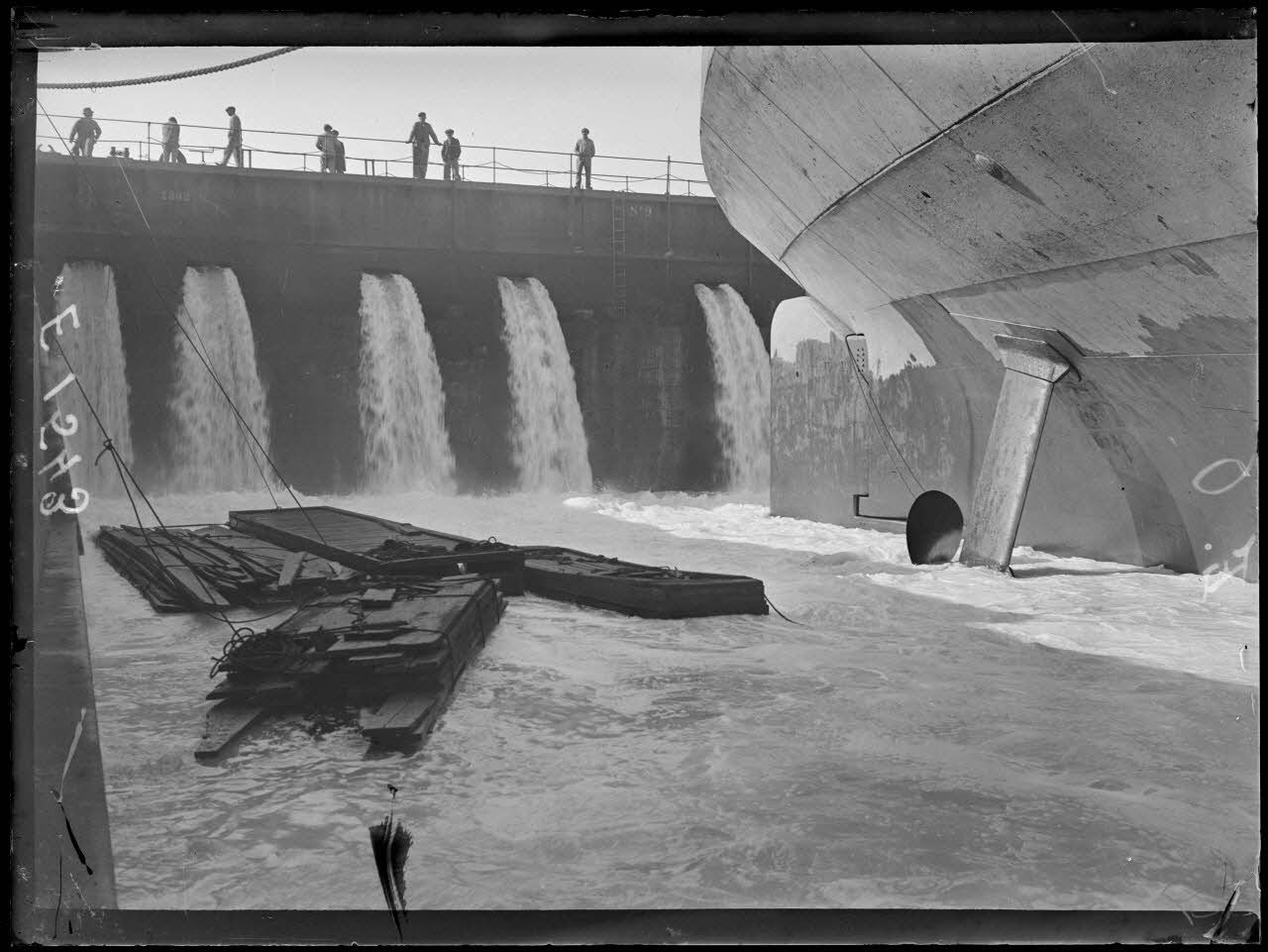 Toulon. L'ouverture des vannes de la cale sèche de "La"France" (cuirassé). [légende d'origine]