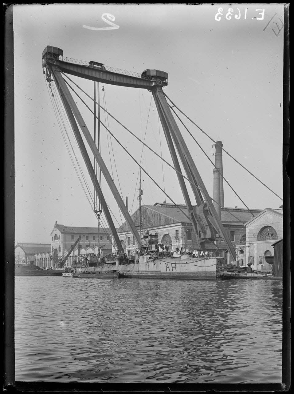 Toulon. Le contre torpilleur Arc faisant enlever ses chaudières pour être réparées. [légende d'origine]