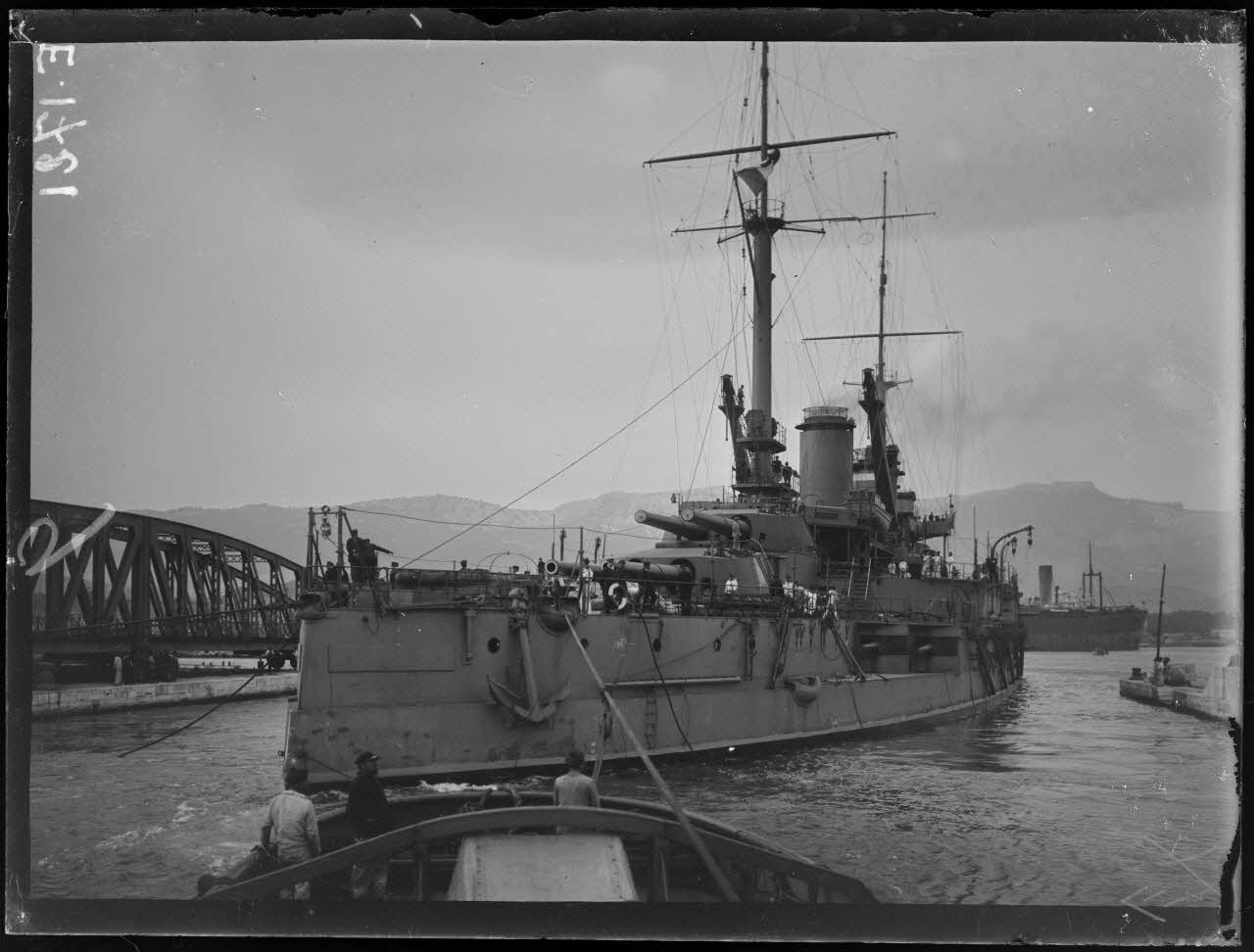 Toulon. Le "Jurien de la Gravière", croiseur de 1er ordre, rentre au bassin pour y être vérifié et réparé.