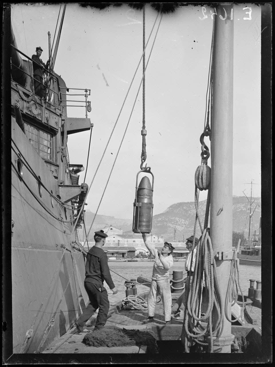 Toulon. A bord du Condorcet. Avant la rentrée en cale sèche, descente de projectiles de 305. [légende d'origine]