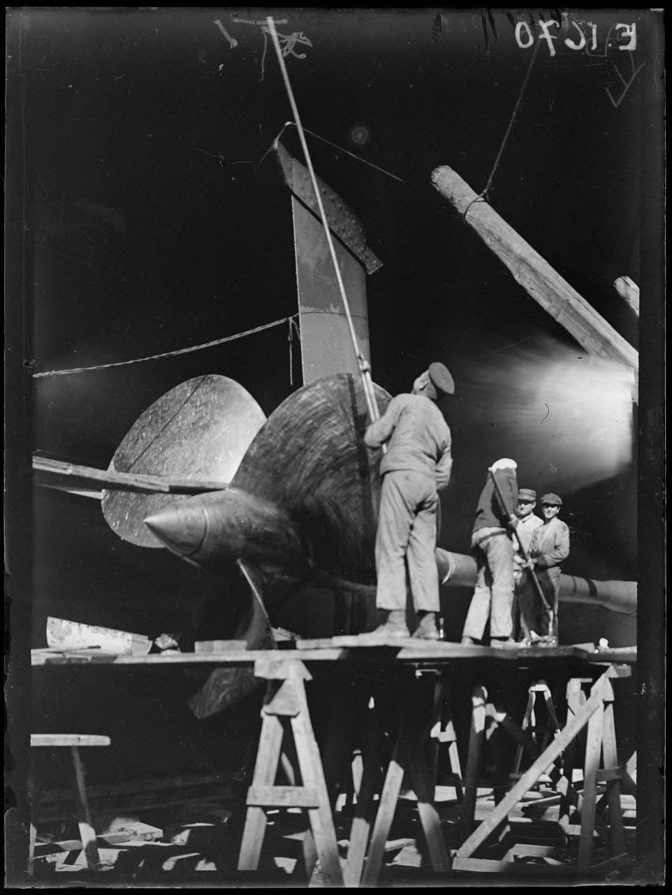 Port de Toulon. Marins peignant la coque du cuirassé de 1er ordre "Bretagne", en cale sèche. Peintre devant une des hélices de la "Bretagne". [légende d'origine]