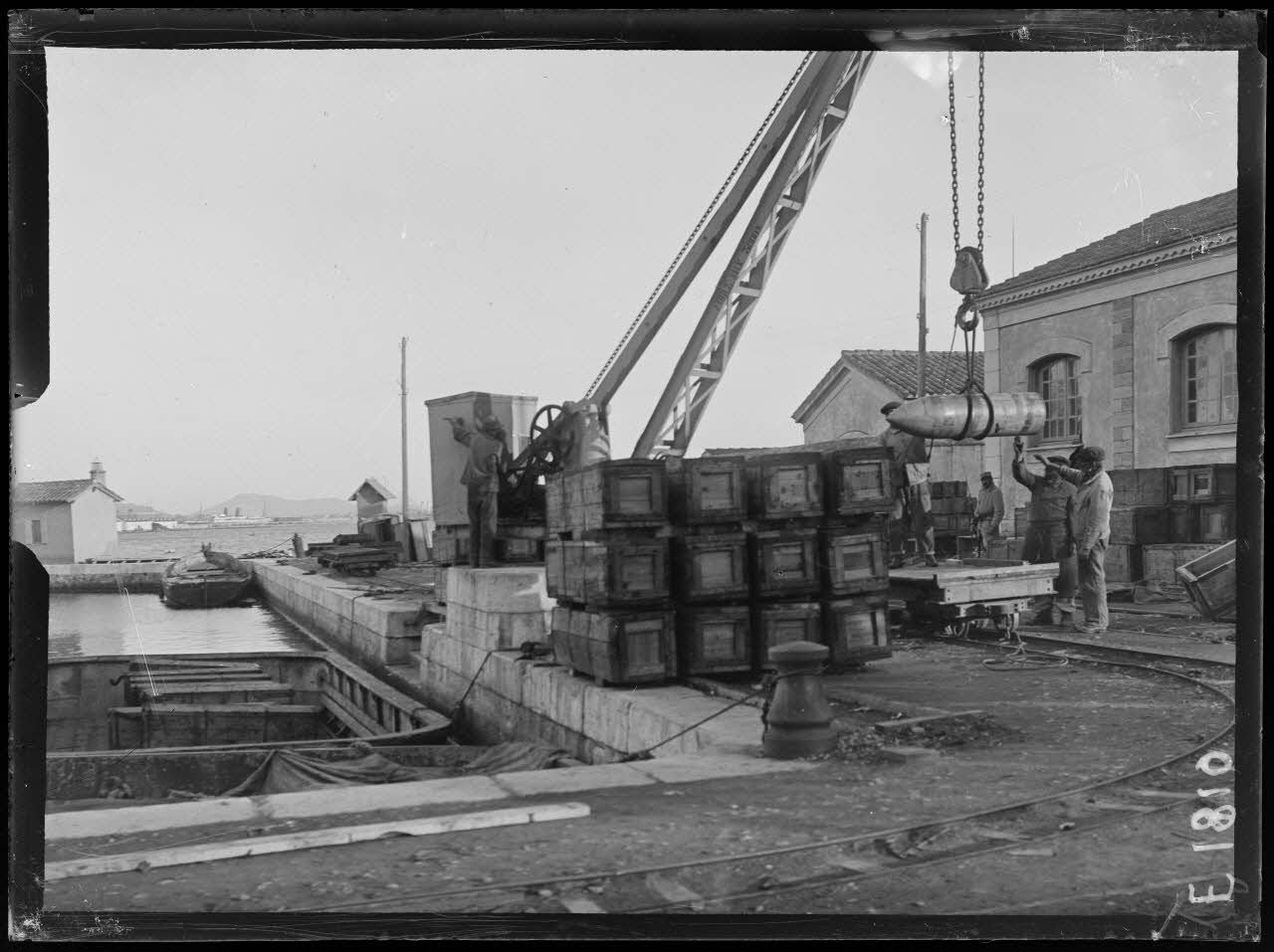 Toulon. Darse de la pyrotechnie. Obus de 400 en caisses venant d'Amérique, déchargés par grue électrique. [légende d'origine]