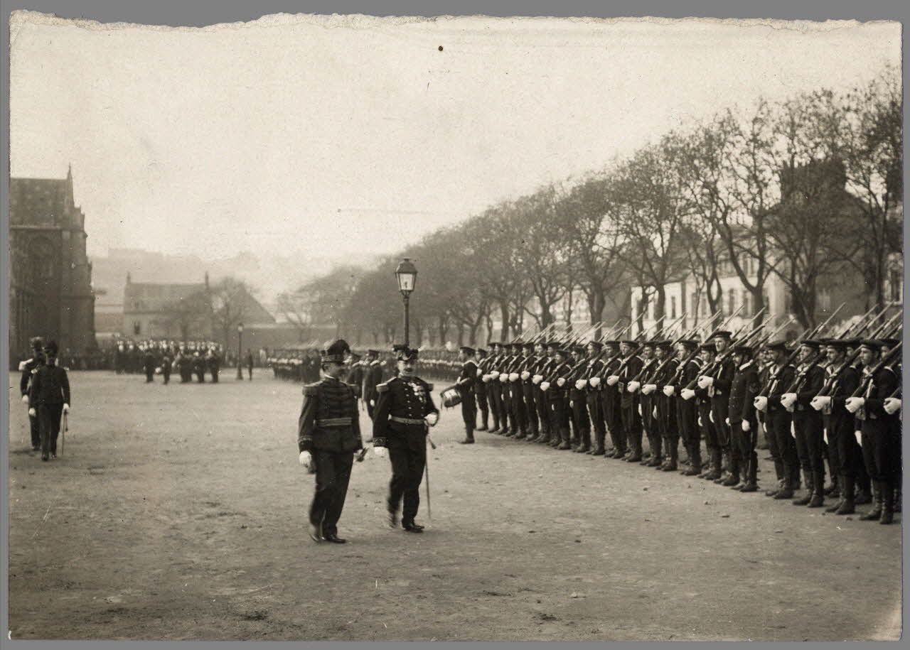 Marine - La revue des fusiliers marins sur la place d'un village.