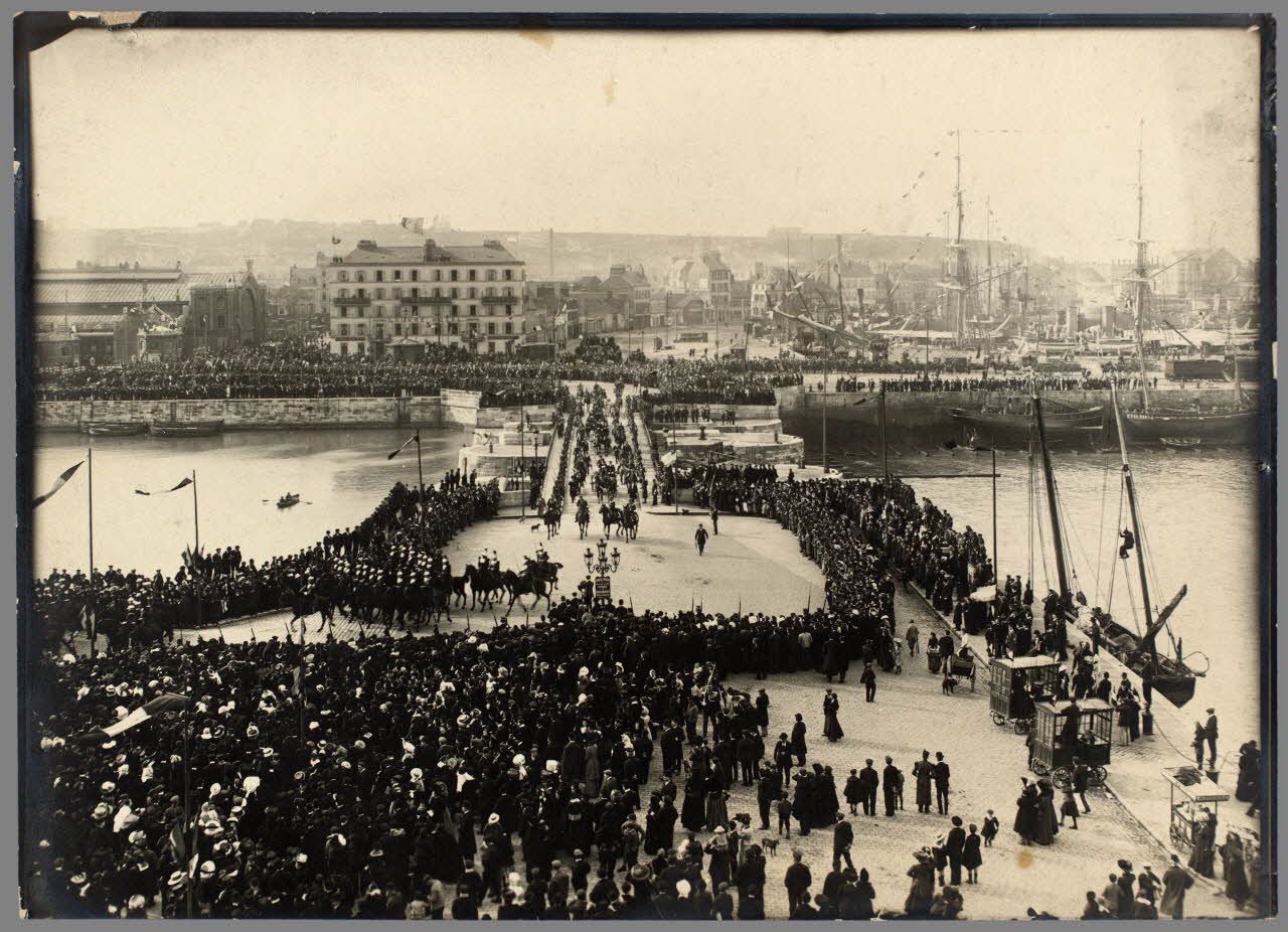 Panorama d'une grande revue militaire sur le quai Gambetta à Boulogne-sur-Mer, voir l'immatriculation du bateau StVss 2205. [légende d'origine]