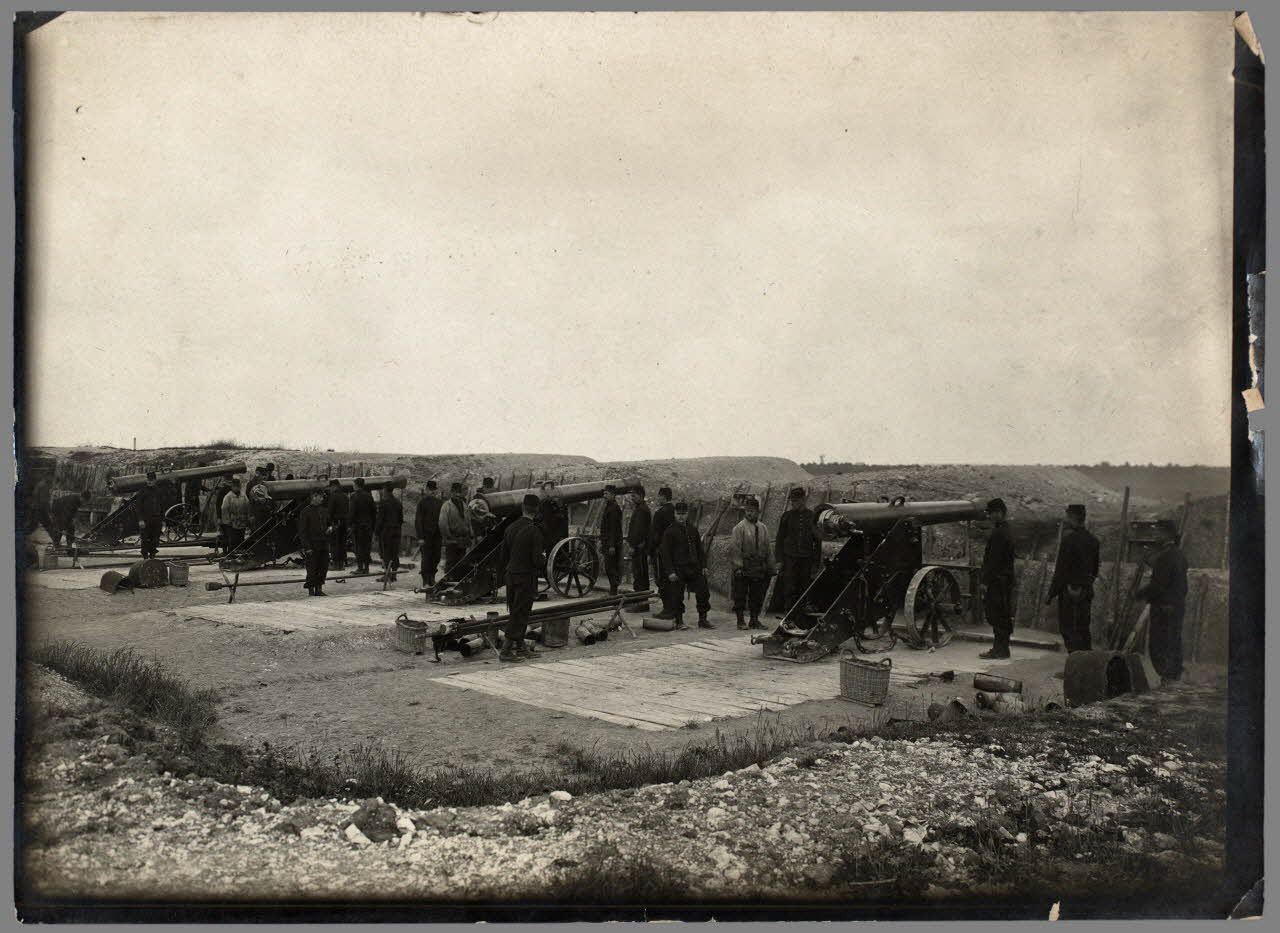 Des artilleurs s'exercent au tir sur le polygone avec des canons de 138 mm modèle 1873-1874 (système de Reffye) disposés en batterie. Ces types de canons appartiennent à l'artillerie à pied et occupent une position soigneusement aménagée à l'aide d'une plateforme en bois. Ce type de canon sera couramment utilisé jusqu'en 1888. Après 1906-1908, il sera définitivement remplacé par des pièces de 120 L produites en grande nombre. En 1914, quelques rares régiments d'artillerie à pied utilisaient encore cette pièce d'artillerie, souvent pour l'instruction des troupes.
