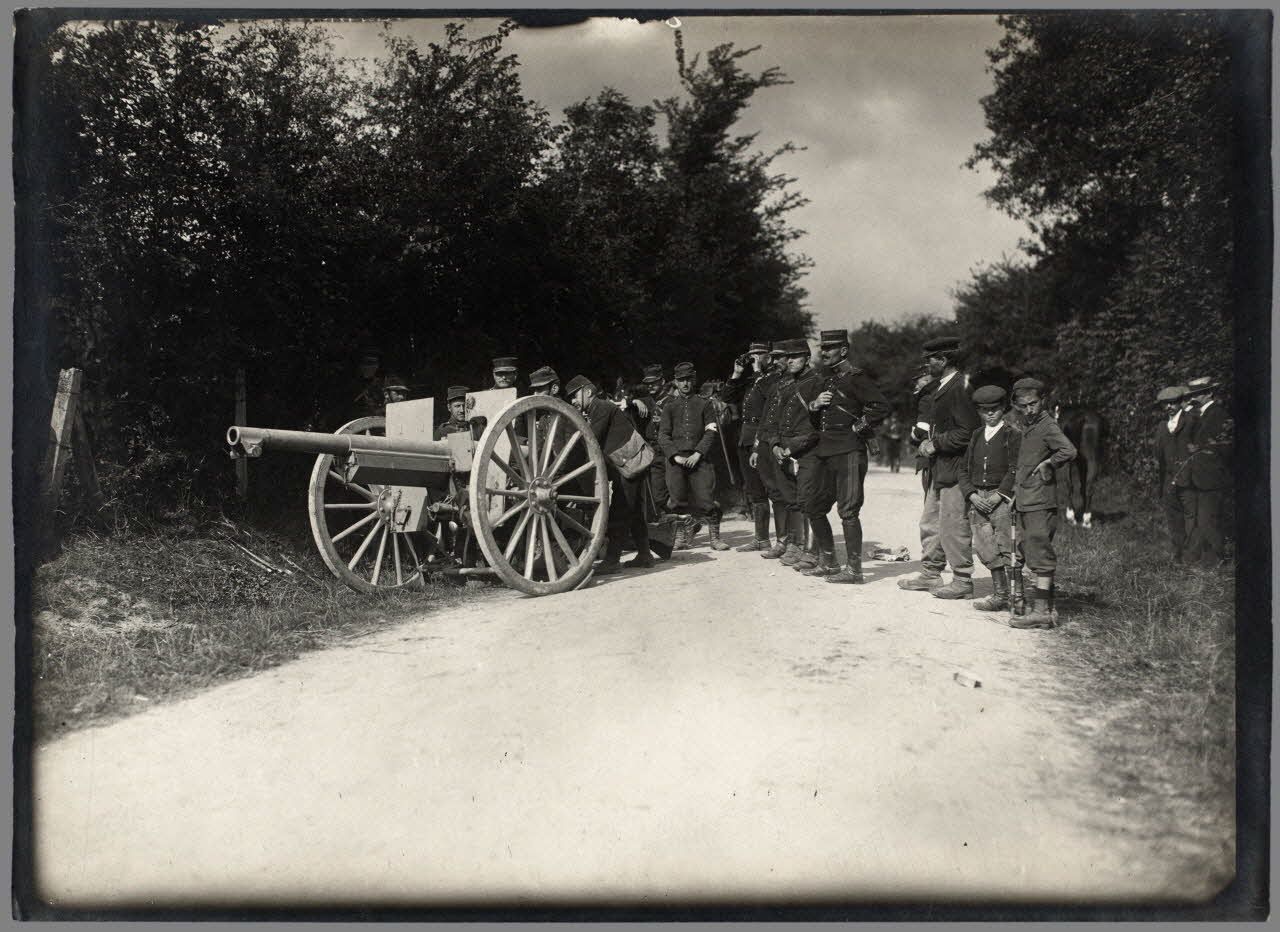 Artillerie - Le canon de 75 mm dans un chemin, encadré par les artilleurs et la population. [légende d'origine]