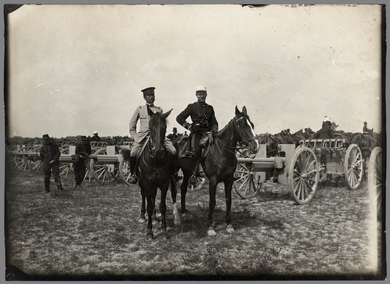 Artillerie - Un capitaine accompagné d'un officier japonais à cheval, en arrière-plan, les batteries de 75 [mm] attelées. [légende d'origine]