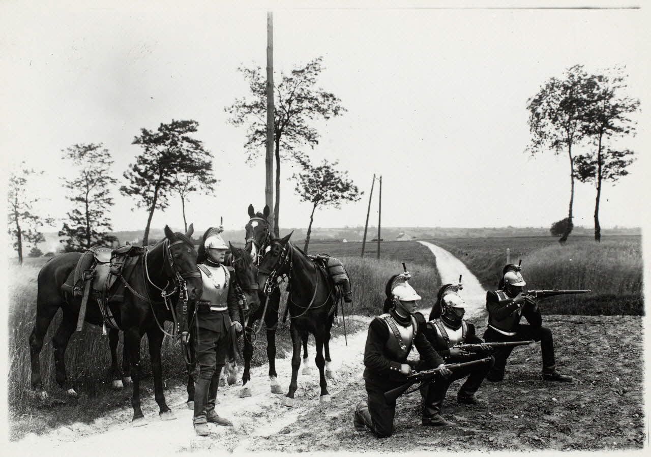 Cavalerie, Arme blindée - Trois soldats du 12e RC visent avec leurs fusils lors d'une manœuvre. [légende d'origine]