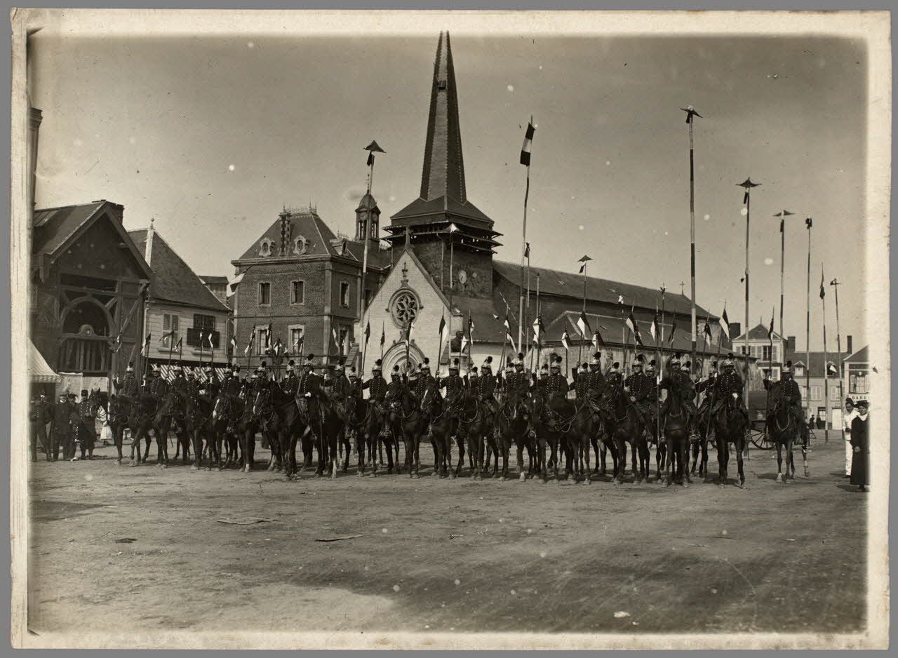 Cavalerie - La revue des dragons sur une place d'un village dans la région de Beauvais. [légende d'origine]