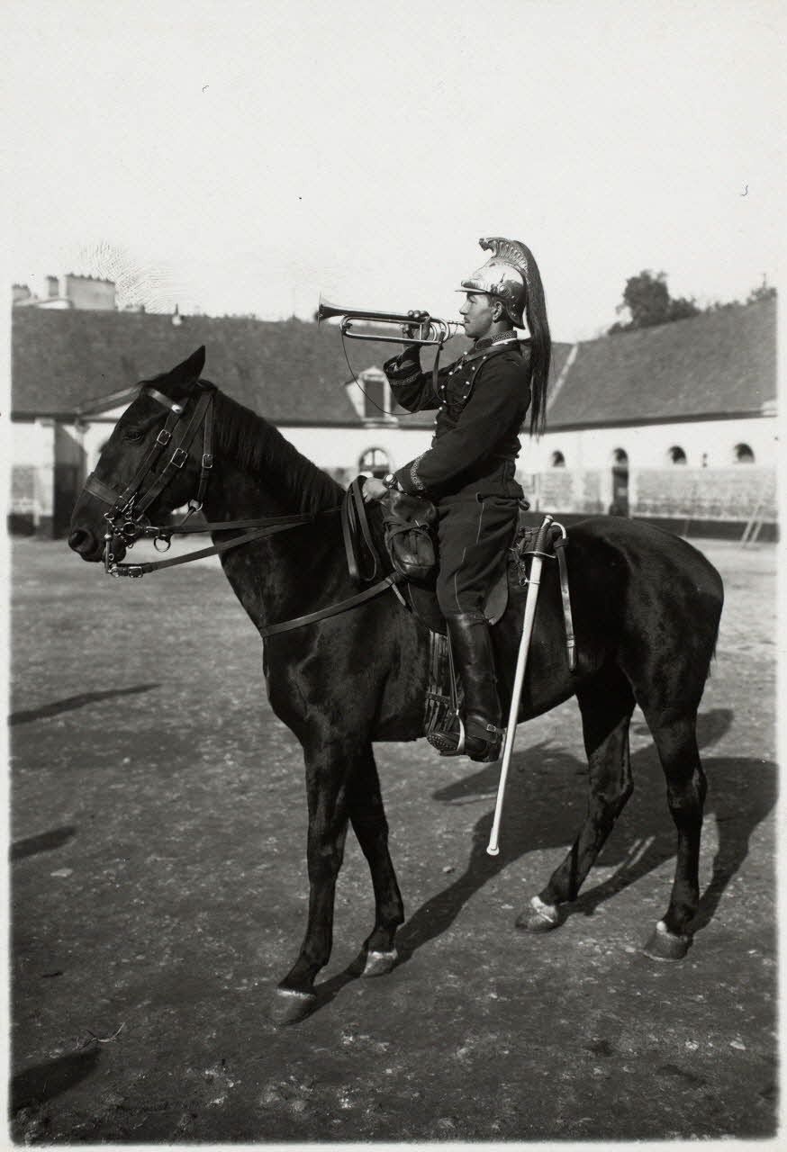 Cavalerie - Un clairon du 27e régiment de dragons dans la cour de la caserne. [légende d'origine]