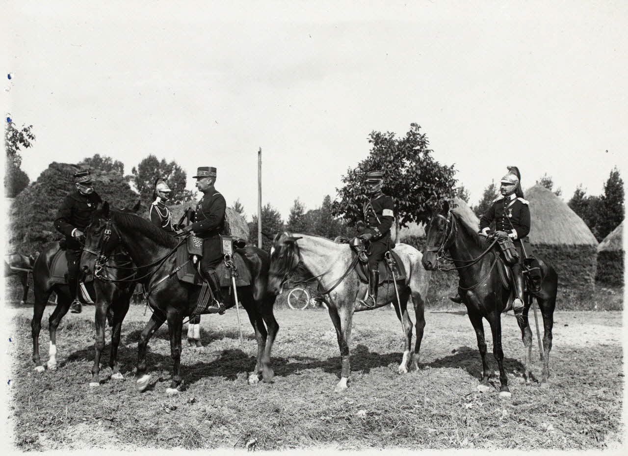 Réunion d'officiers à cheval, on distingue un dragon et un second dragon d'état-major. [légende d'origine]