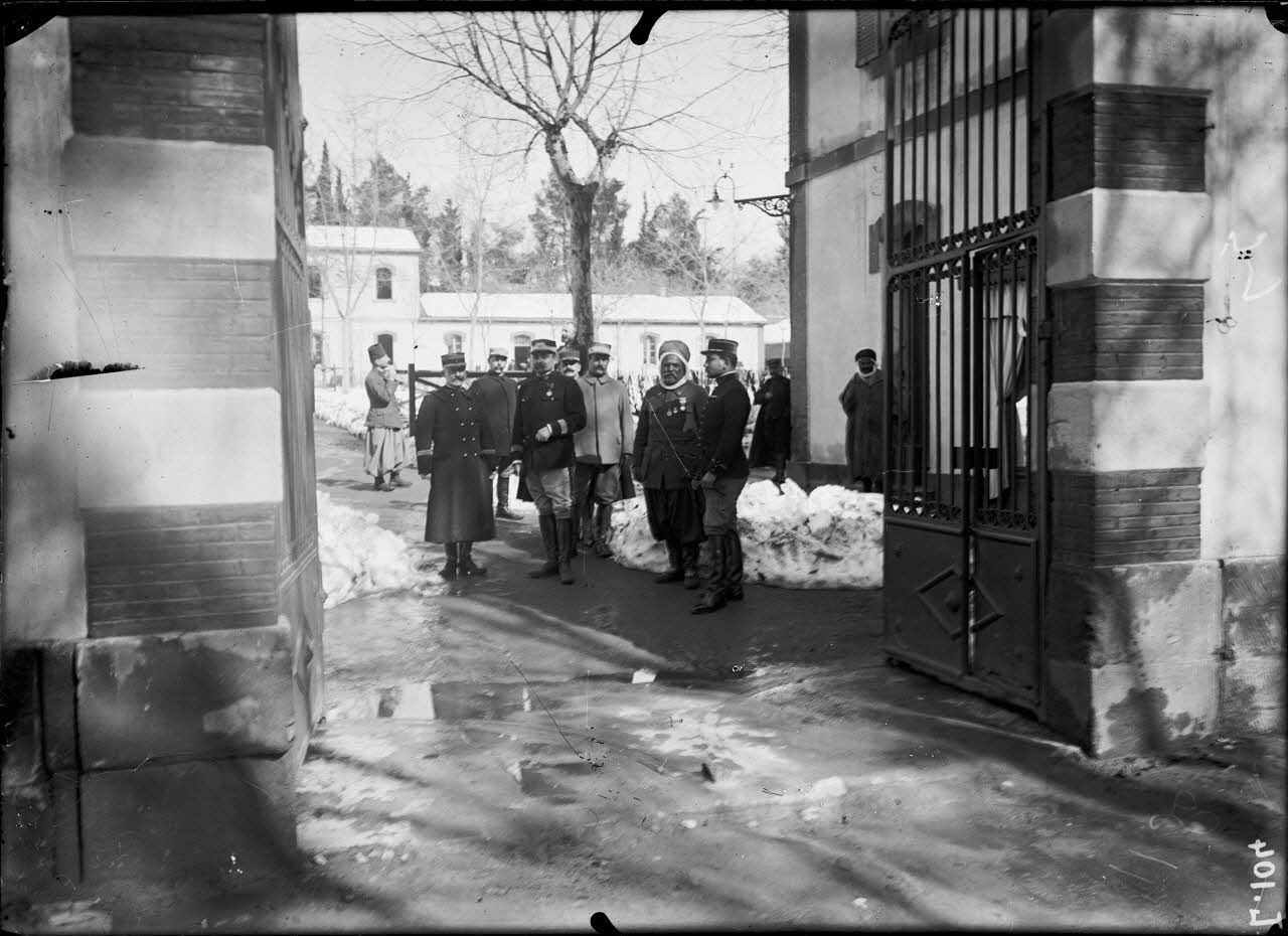 - le 1er régiment de spahis (1er RS), quartier Yussuf à Médéa : le chef de corps (le commandant Legrand) avec ses officiers à l'entrée du quartier, des soldats de l'arme du train déjeunent dans la cour enneigée ;