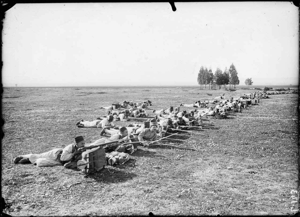 - l'école de tir d'artillerie de montagne à Sétif : le 3e régiment de Zouaves (3e RZ) sur le terrain de manœuvres s'entraînant sur des canons de 65 mm M 1906 ;