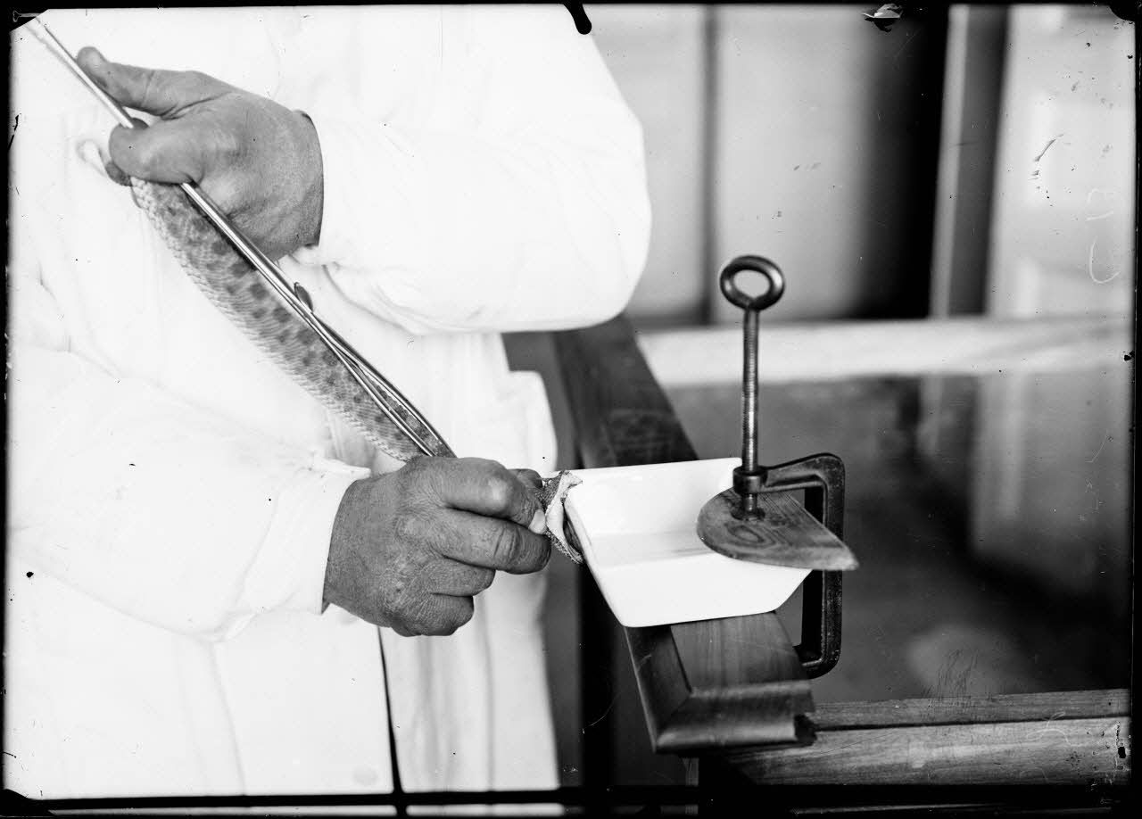 Institut Pasteur d'Alger. Extraction du venin de la vipère à corne. 19-2-16. [légende d'origine]