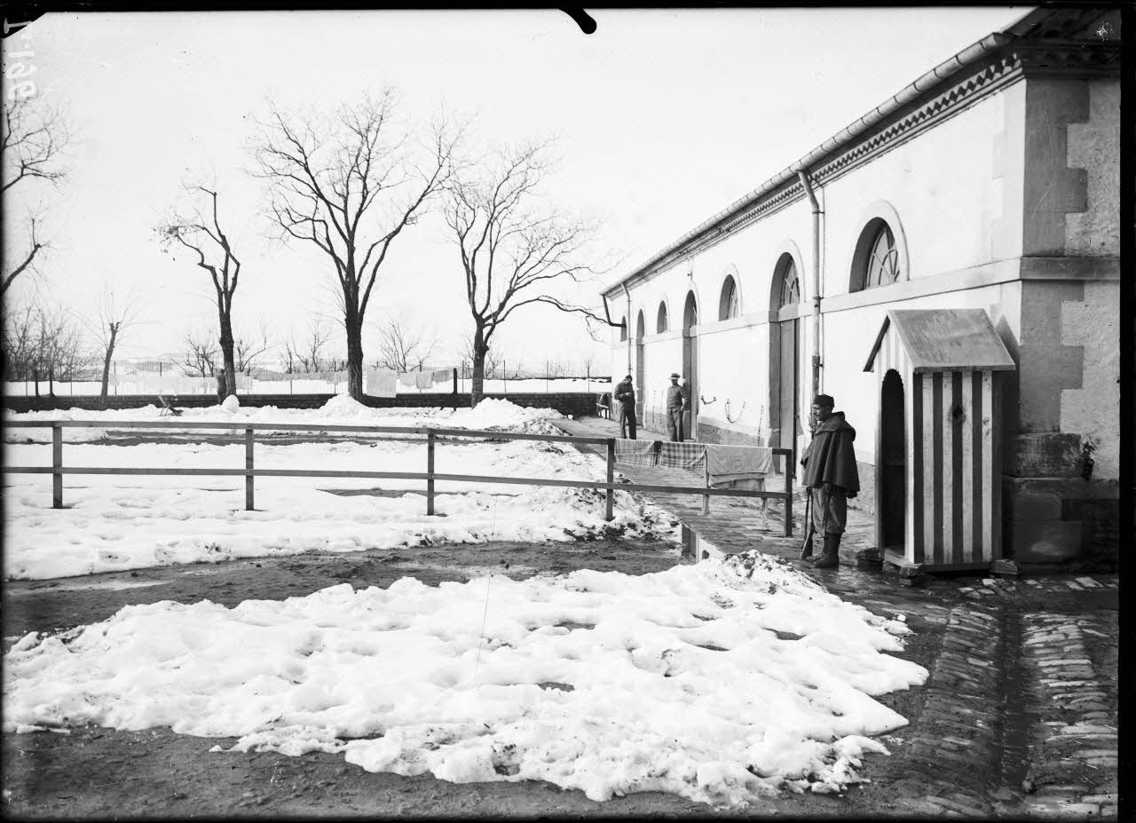 - le 1er régiment de spahis (1er RS), quartier Yussuf à Médéa : le chef de corps (le commandant Legrand) avec ses officiers à l'entrée du quartier, des soldats de l'arme du train déjeunent dans la cour enneigée ;