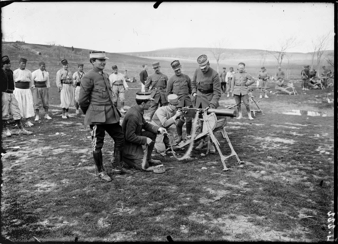 - le centre d'instruction des mitrailleurs de Constantine : une section de mitrailleurs en marche, le campement des mitrailleurs, les zouaves (vraisemblablement) à l'exercice sur différents types de mitrailleuses ( la sMG-08 Maxim allemande et la Saint-Etienne M1907 française), certains zouaves sont munis de fusils Lebel M1886/93 (SPA L 212/223) ;