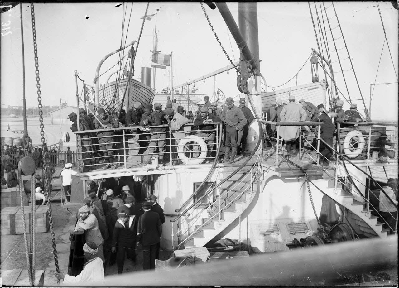 Au départ de Bizerte. Sur l'Eugène Pereire transportant les troupes. [Légende d'origine].