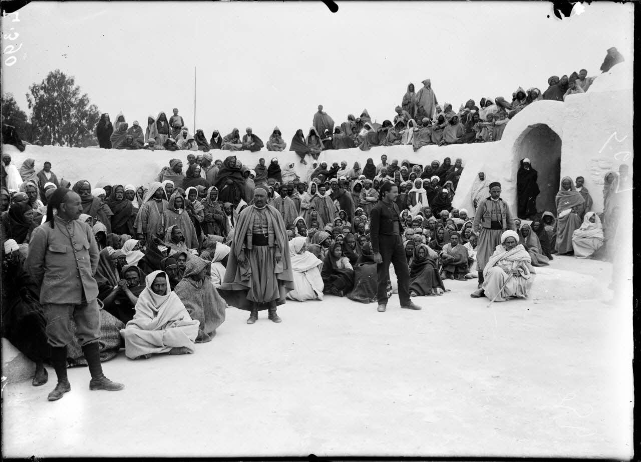 Ile de Djerba (sud Tunisie). Dans une cour de mosquée, l'appel des indigènes devant passer devant une commission de recrutement. 15.3.16. .