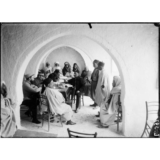 Ile de Djerba (sud Tunisie). Dans une cour de mosquée, l'appel des indigènes devant passer devant une commission de recrutement. 15.3.16. .