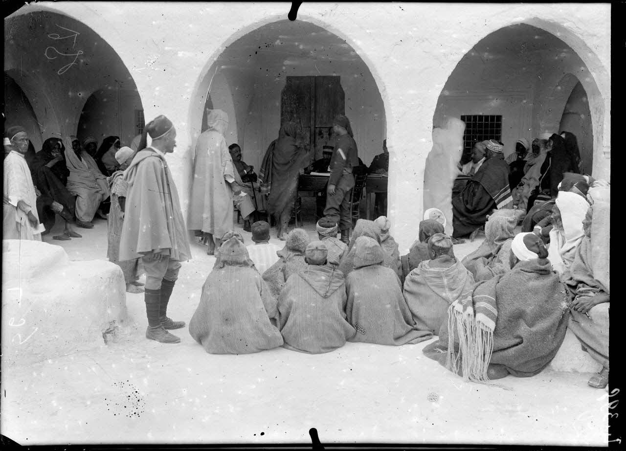 Ile de Djerba (sud Tunisie). Dans une cour de mosquée, l'appel des indigènes devant passer devant une commission de recrutement. 15.3.16. .