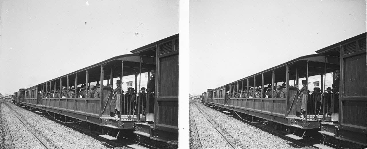301. Voyage de Hanoï à Laokay (avril 1906). Tonkin. Lao Kay. En gare d'Hanoï. Le train. Wagon de quatrième classe pour indigènes. [synthèse de deux légendes d'origine]