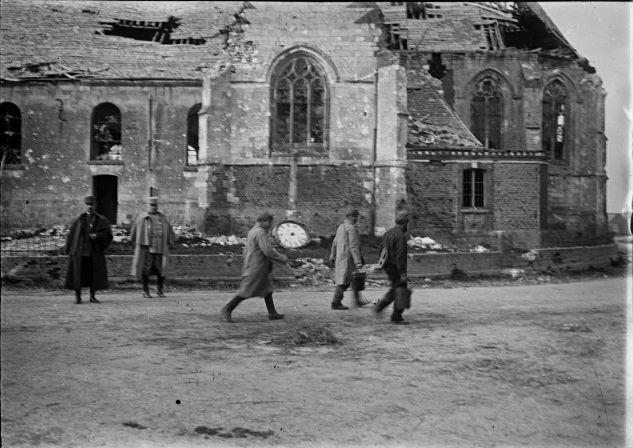 Deux officiers généraux visitent Bouchoir, village au sud d'Amiens entièrement dévasté tandis que trois hommes traversent la rue et passent devant l'église Saint-Pierre en ruine.