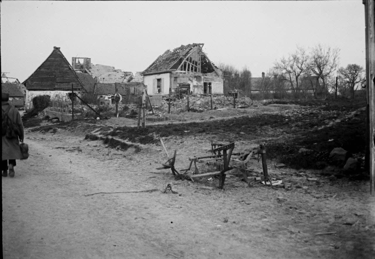 Rue de Bouchoir, village en ruines au sud d'Amiens, lors d'une visite. On aperçoit un cimetière de fortune sur la droite.