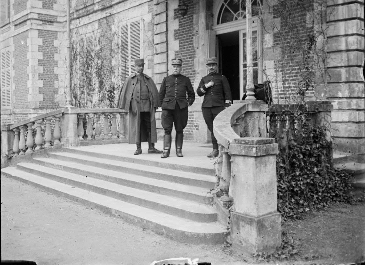 Trois officiers supérieurs dont un général qui pourrait être le général de Lamothe posant sur le péron du château de Dury.