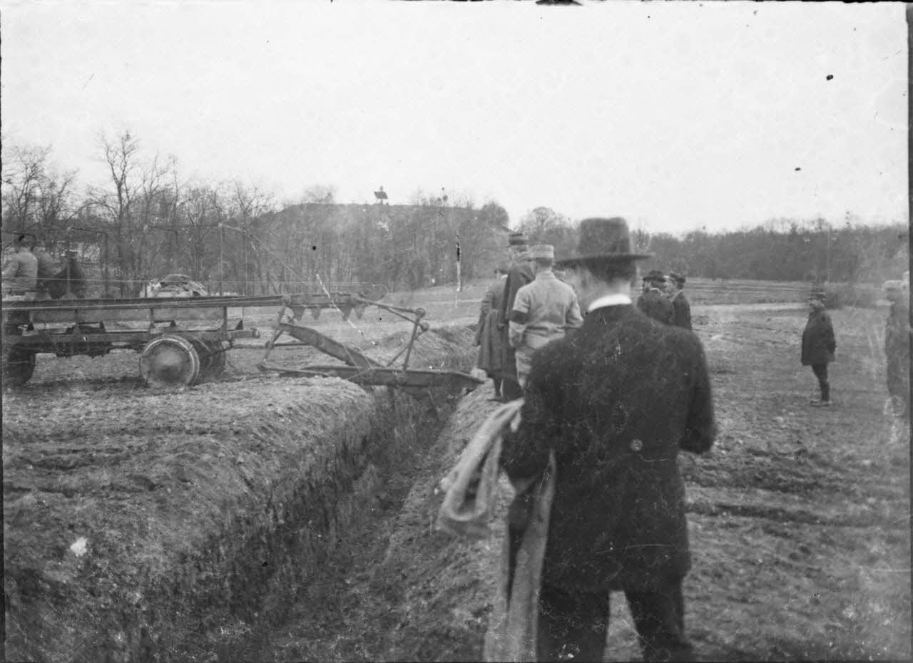 Présentation à un ensemble d'autorités civiles et militaires d'un appareil spécial développé par les usines Delaunay-Belleville. Dans l'optique de franchir les tranchées, un véhicule sur roues a été muni d'un système de rails mobiles lui permettant de rouler au-dessus de ces dernières.