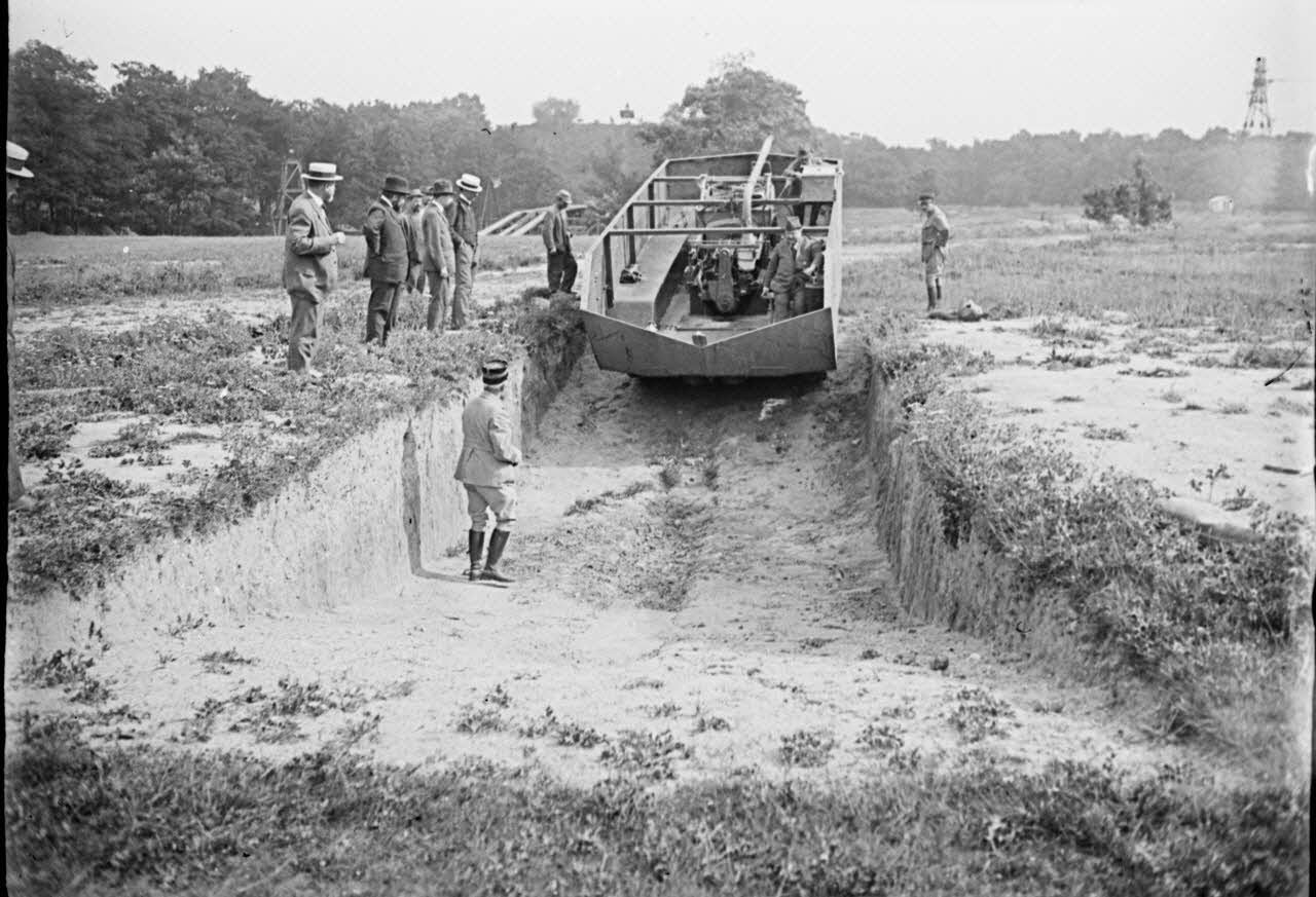 Essais d'un prototype de char Saint-Chamond ainsi que d'un appareil de franchissement de tranchées probablement à Vincennes en juillet 1916.