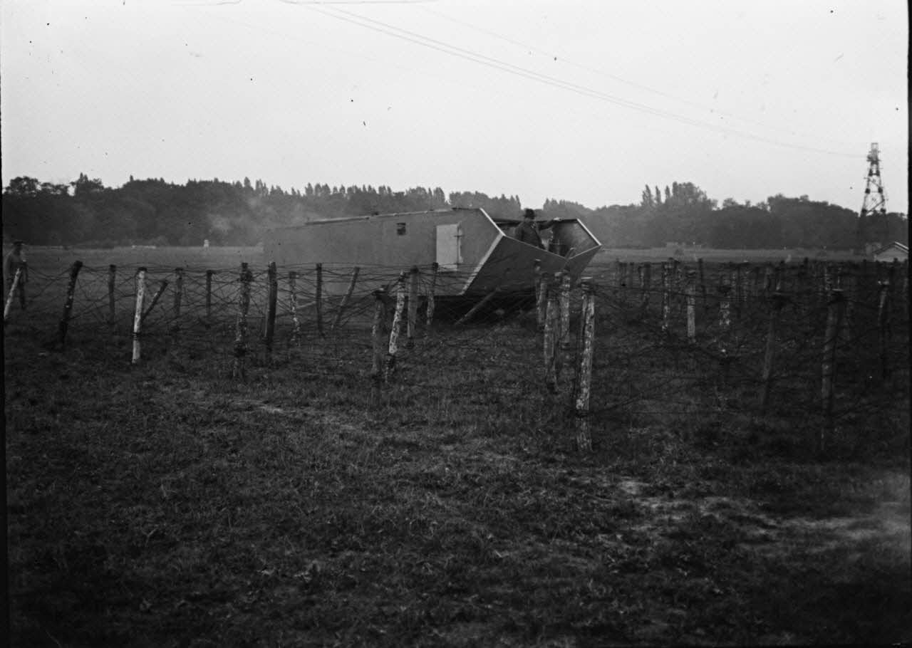 Essais d'un prototype de char Saint-Chamond ainsi que d'un appareil de franchissement de tranchées probablement à Vincennes en juillet 1916.