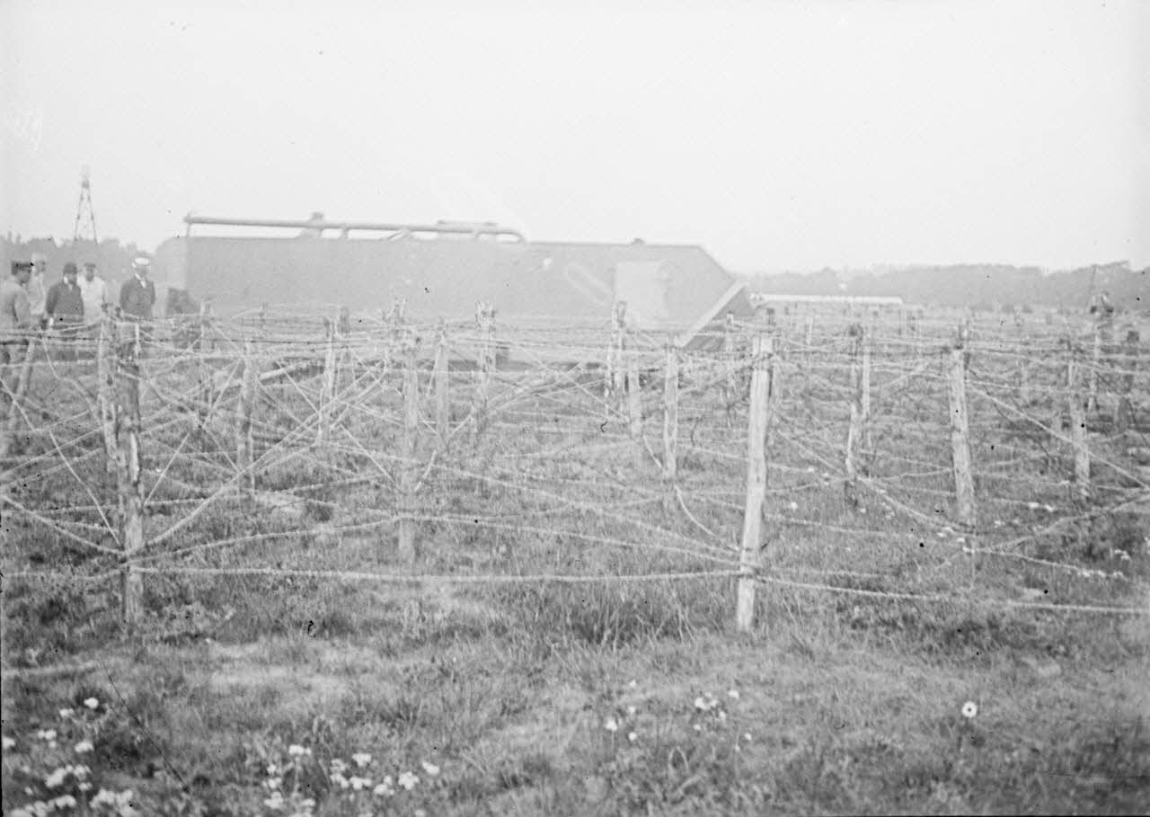 [Caterpillar d'assaut type St Chamond traversant un réseau de barbelés. Vincennes, juillet 1916.]