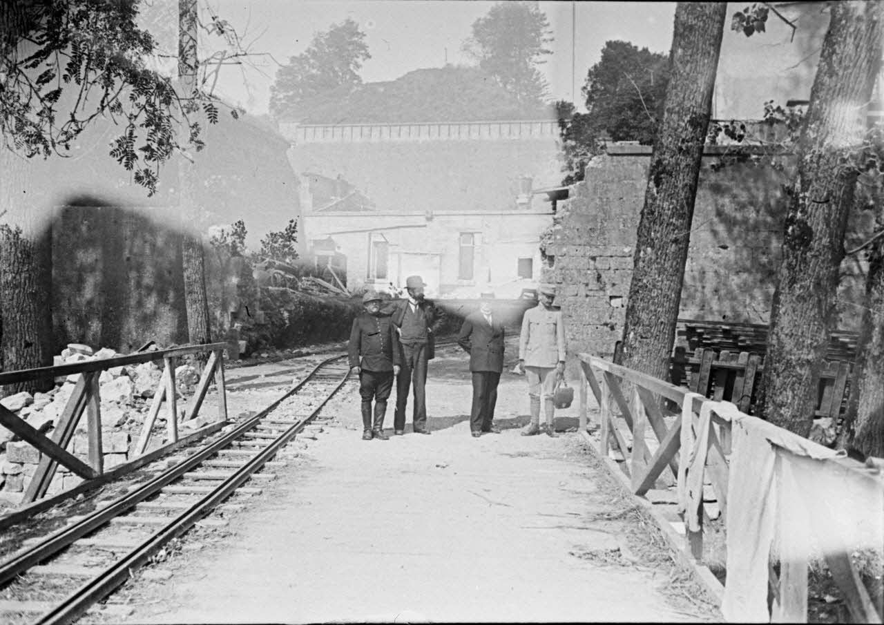 Trois hommes posant sur un pont de Verdun sur lequel des rails ont été disposés.