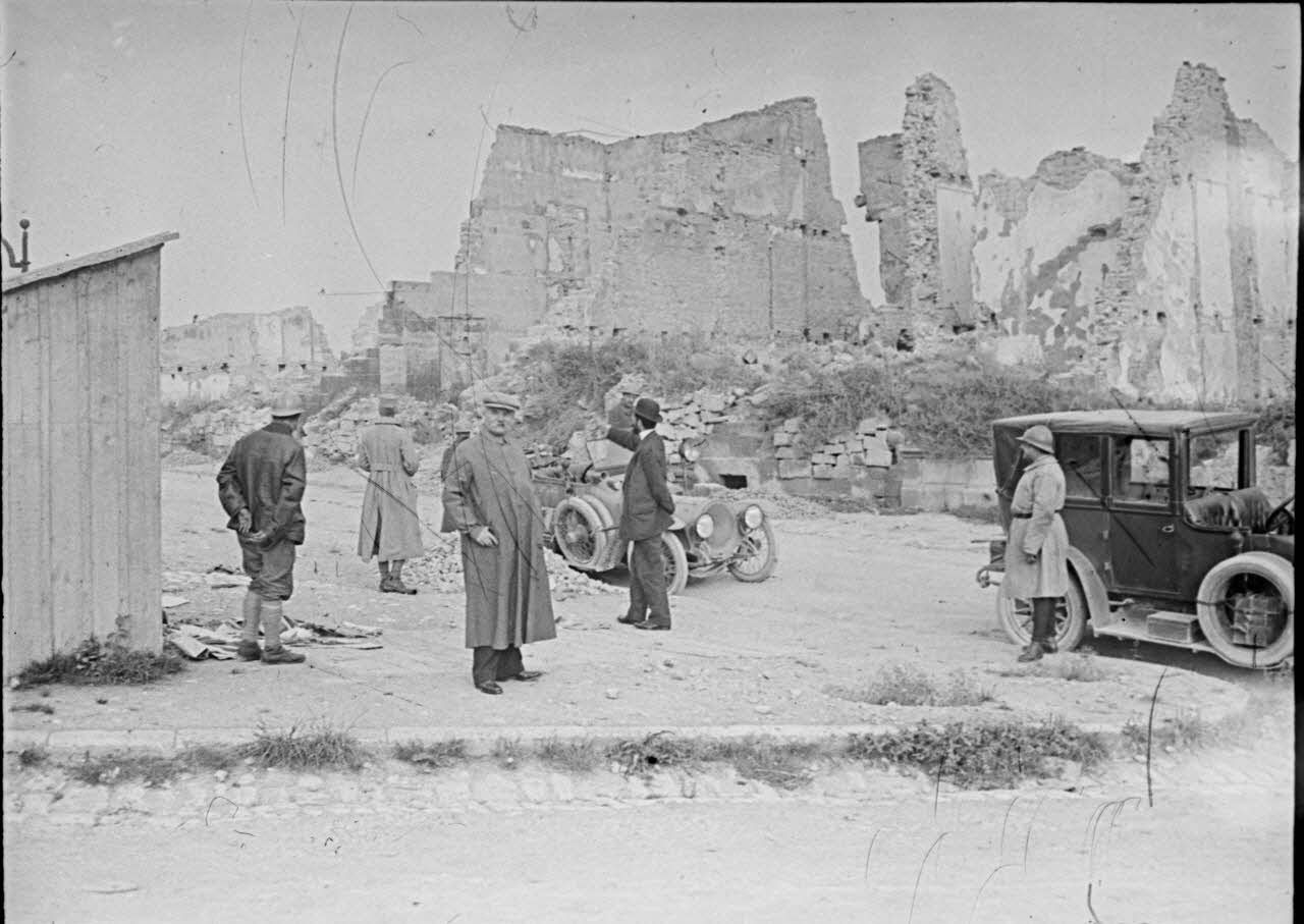 Visite de Verdun et de Clermont-en-Argonne, toutes deux en ruines, par une délégation d'officiels.