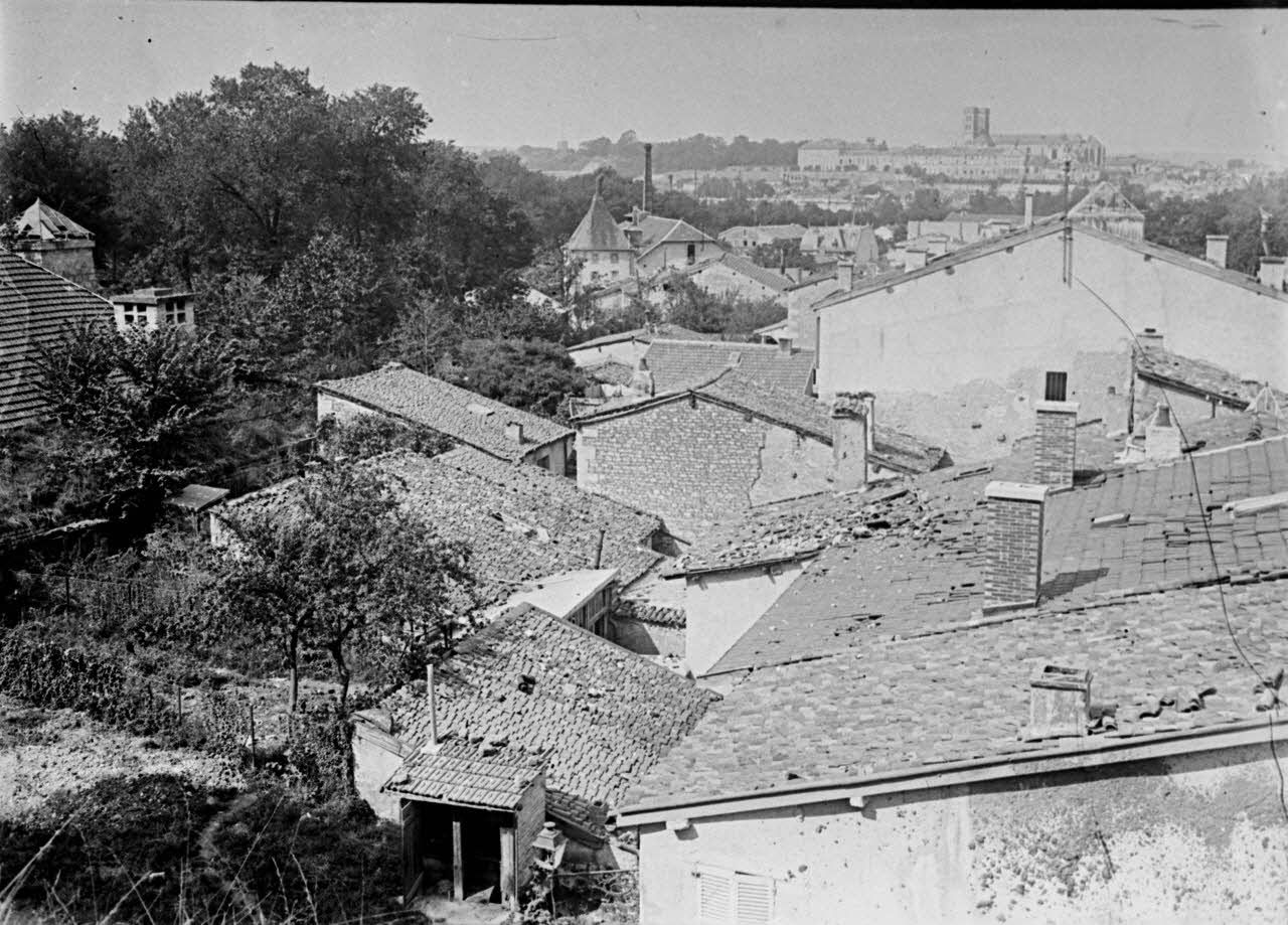 Vue sur les toits d'un quartier périphérique de Verdun, avec en arrière-plan la cathédrale et le palais épiscopal de la ville.