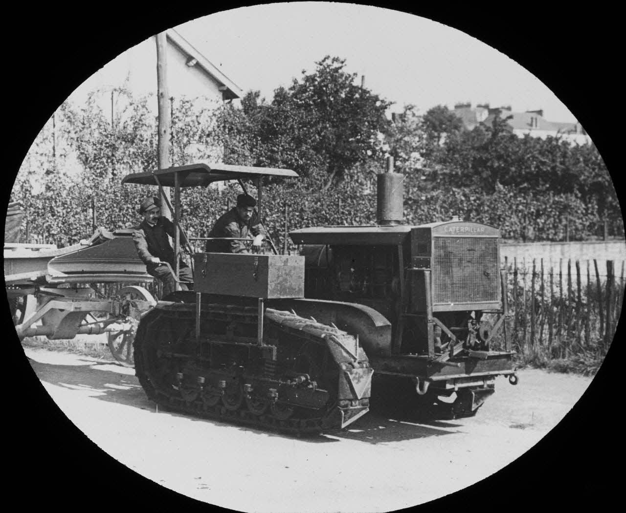 13. [Conduite d'un tracteur caterpillar Holt dans un village, s.d.]