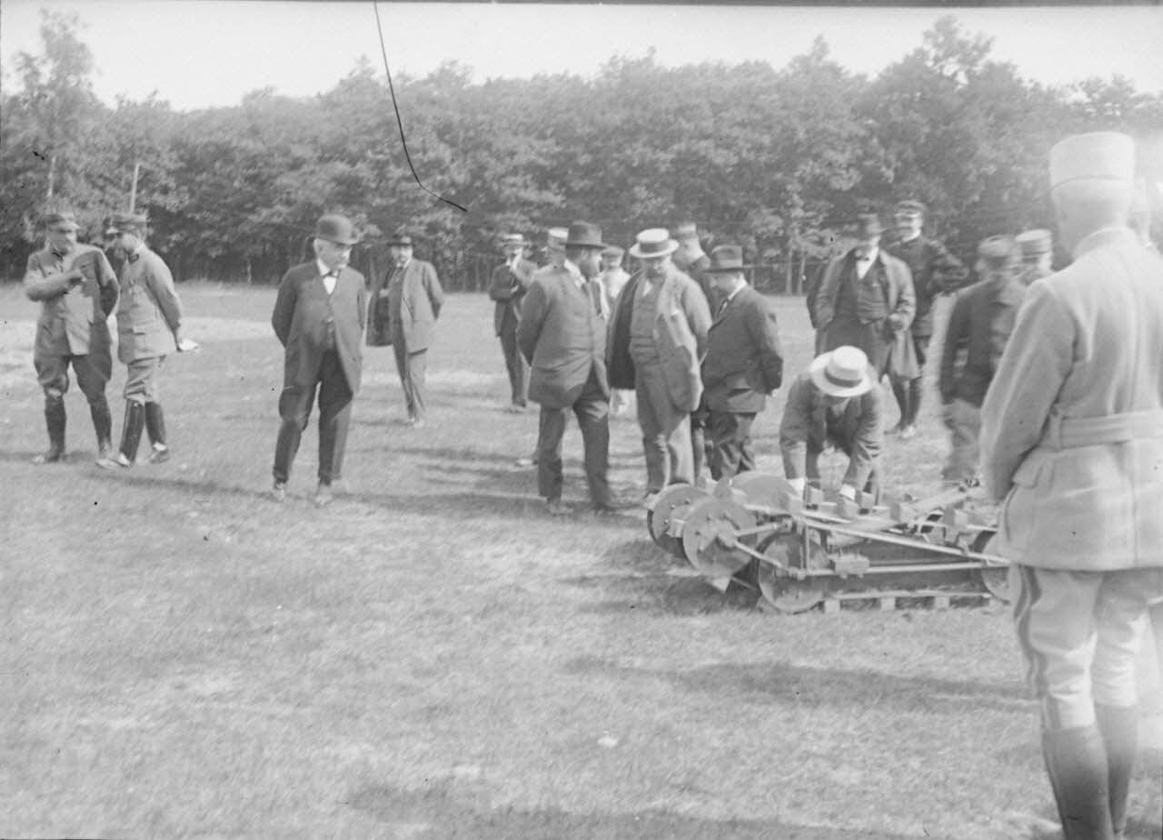 Visite officielle à l'occasion des essais d'un canon de 75mm et démonstration du fonctionnement d'une chenille mécanique.