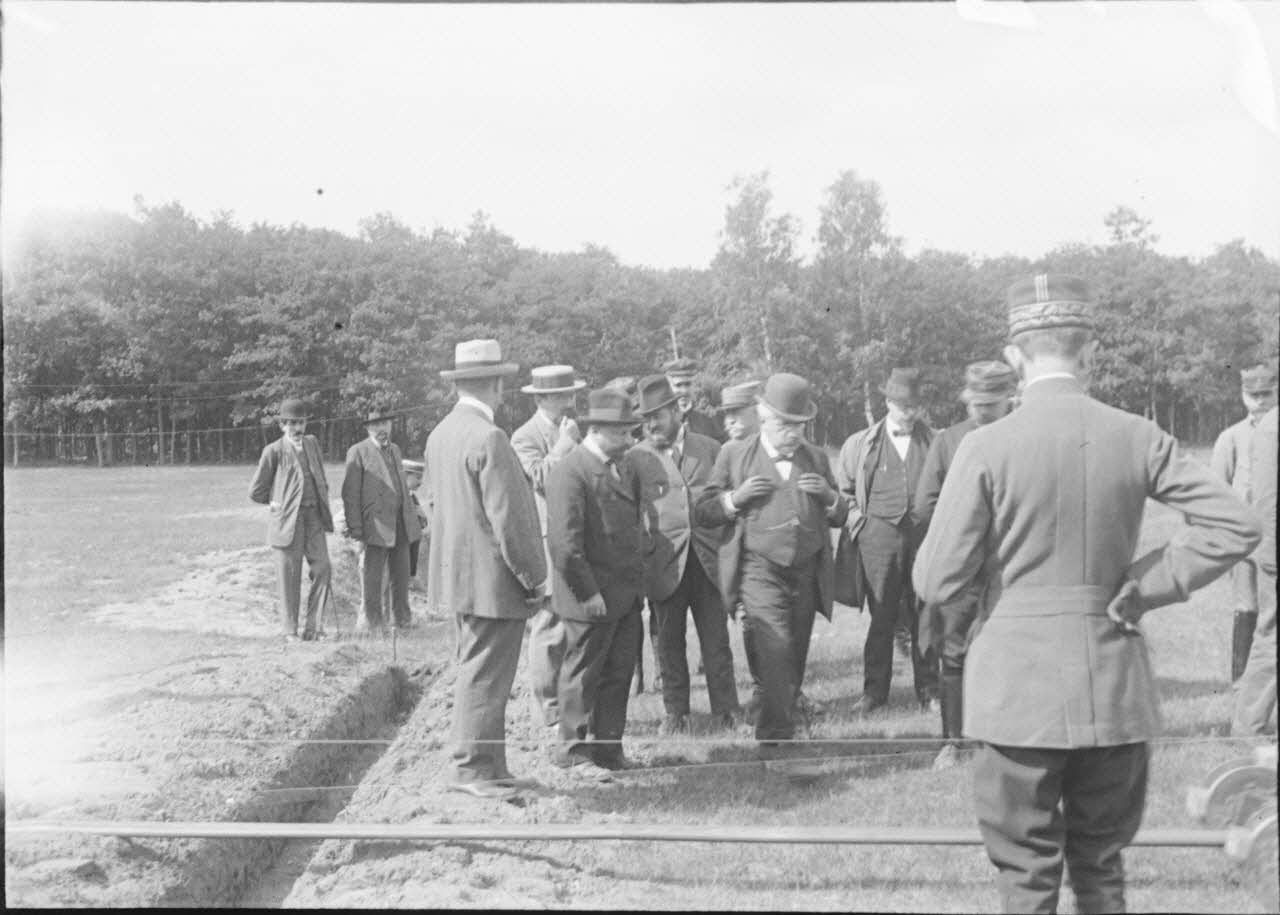 Visite officielle à l'occasion des essais d'un canon de 75mm et démonstration du fonctionnement d'une chenille mécanique.