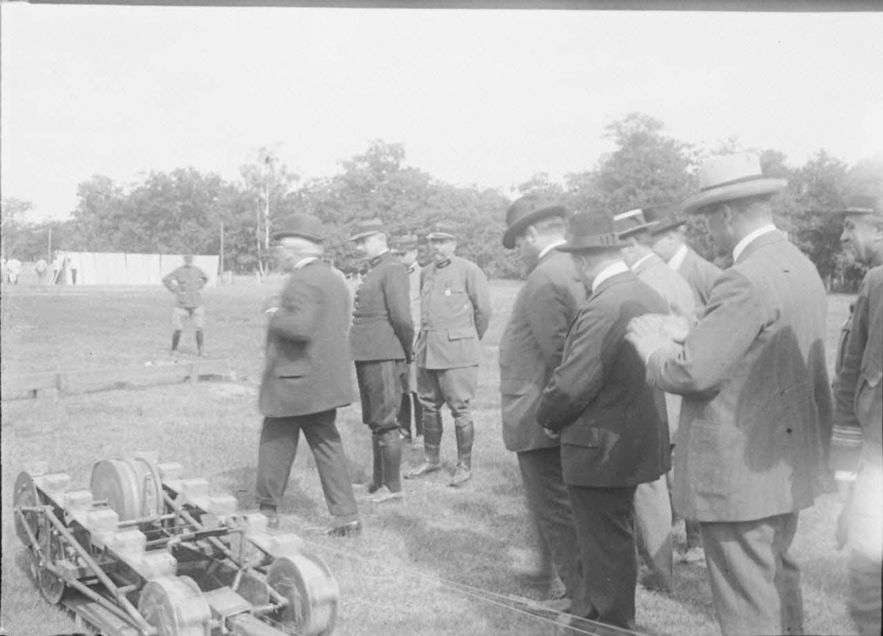 [Groupe d'autorité observant le passage d'une chenille en expérimentation, s.d.]