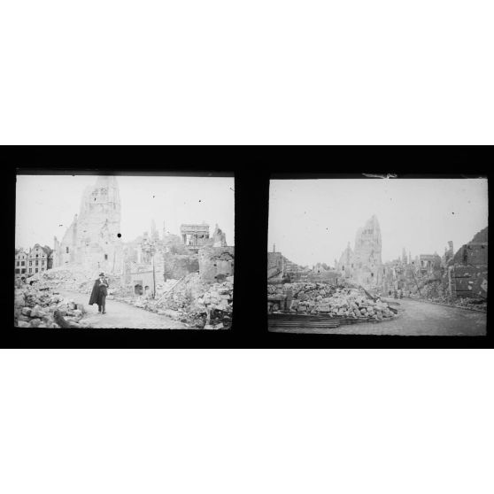 Contenant des positifs sur plaques de verre, la boîte constituée ici en reportage retrace pêle-mêle différents moments de visites dans les régions où se déroulent les combats : tirs d'artillerie, visite de Bouchoir ou encore au château de Dury et même plus loin avec la visite de la ville d'Ypres en Belgique, tous ces évènements témoignent du soucis des autorités de constater dans l'immédiateté les effets de la guerre et pourraient avoir été prises en 1915.