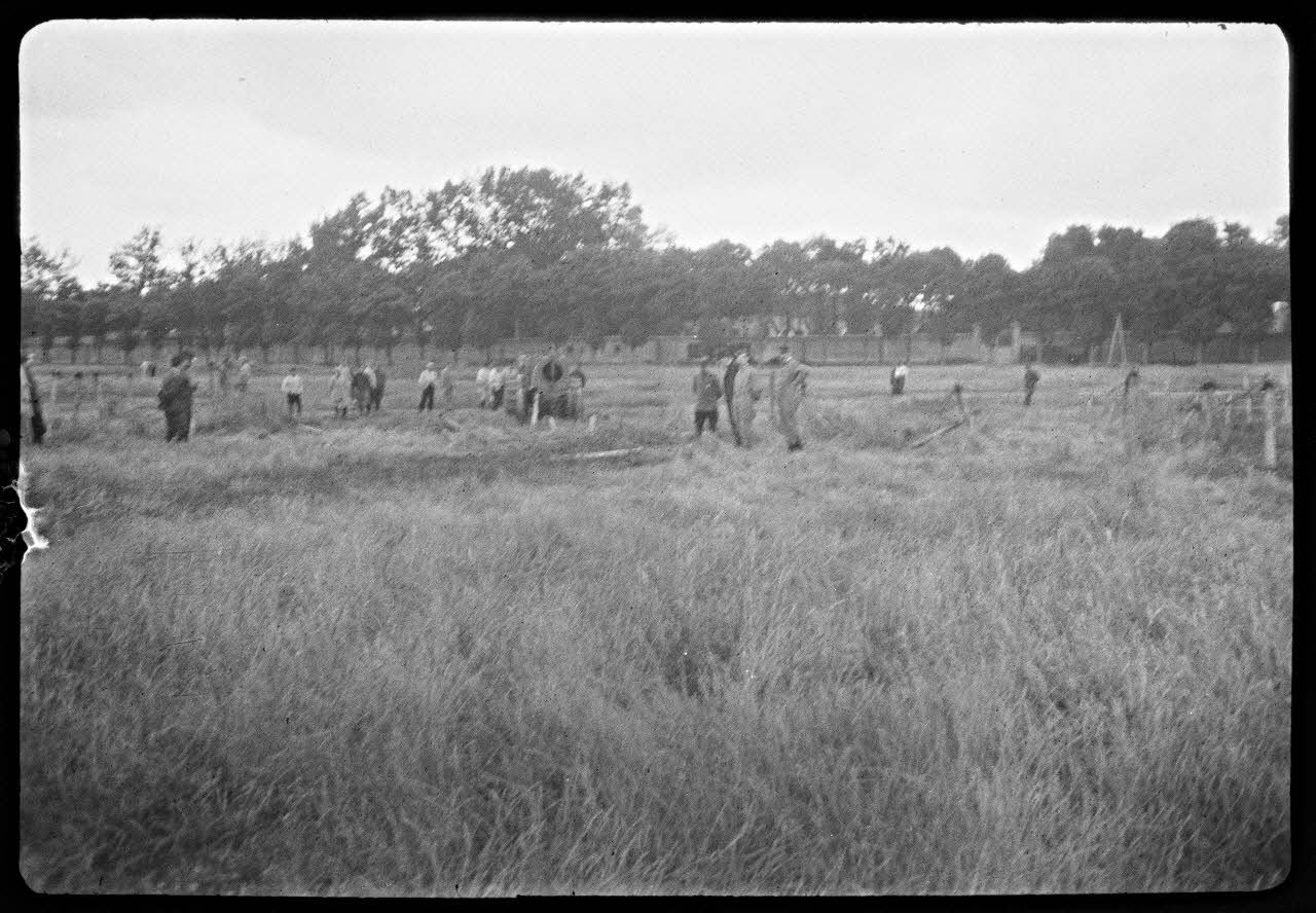 Groupe de civils et militaires assistant à l'essai d'une machine dite "Breton-Prétot".