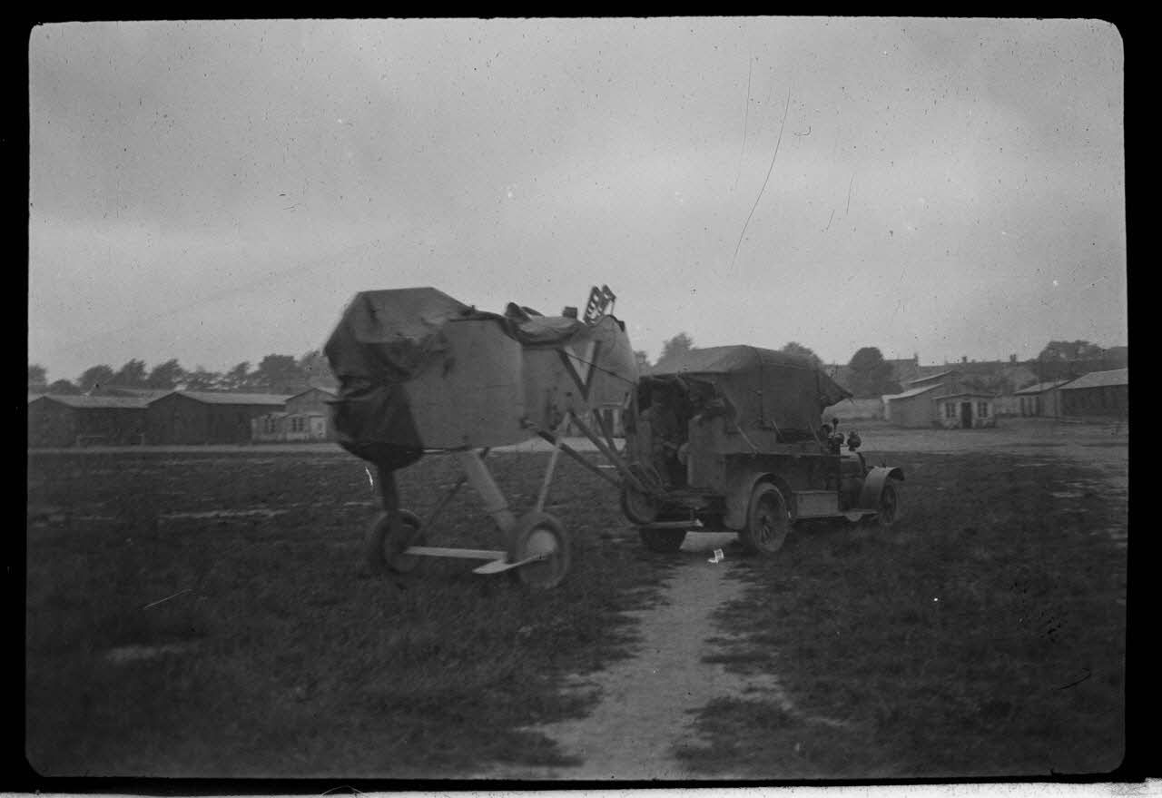 [Remorquage du fuselage d'un avion Voisin type III en voiture sur un terrain d'aviation, s.d.]