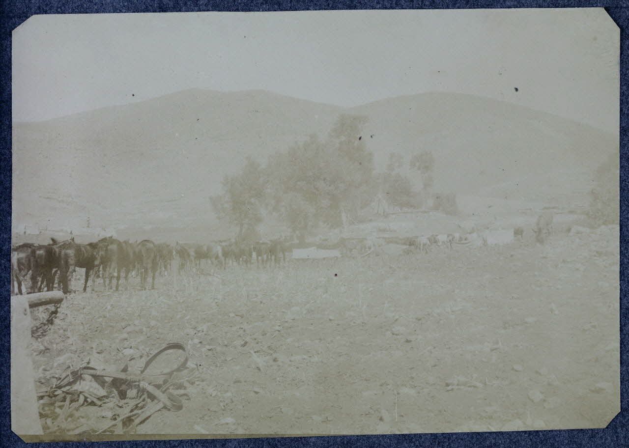Esiclav (Macédoine). Le campement après notre plus rude étape. 42 kil[omètres] dont 17 de montée p[our] passer le col de Verria 100 d'altitude. [légende d'origine]