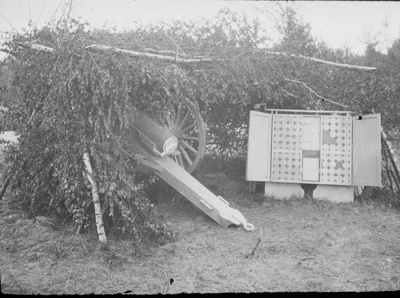 Canon de 75 mm et son caisson camouflés sous des branchages.