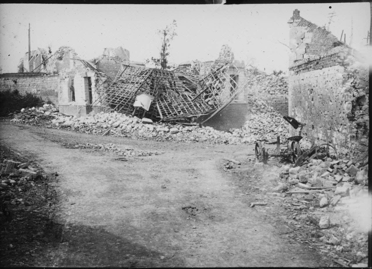 Vues d'un village en ruines et notamment d'habitation dont il ne reste plus que la charpente.