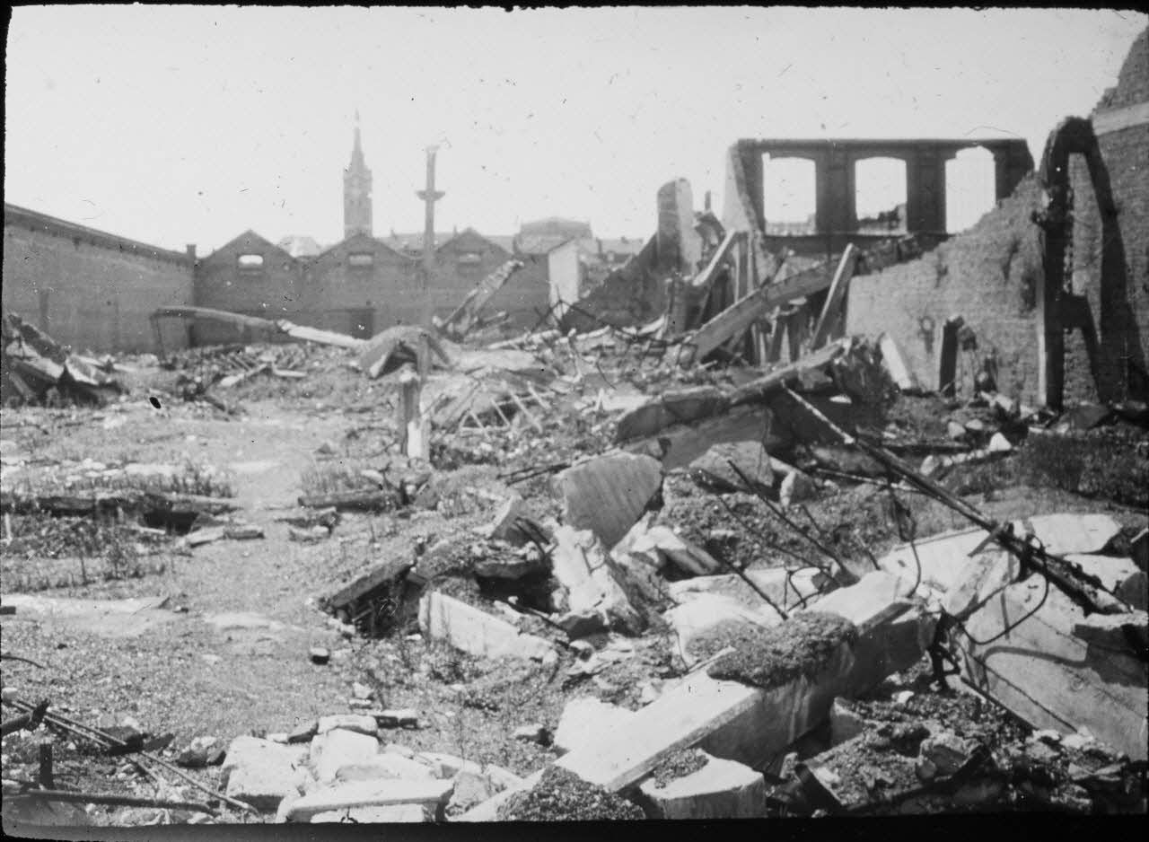 Débris gisant au sol dans un village détruit. On aperçoit au loin le clocher d'une église.